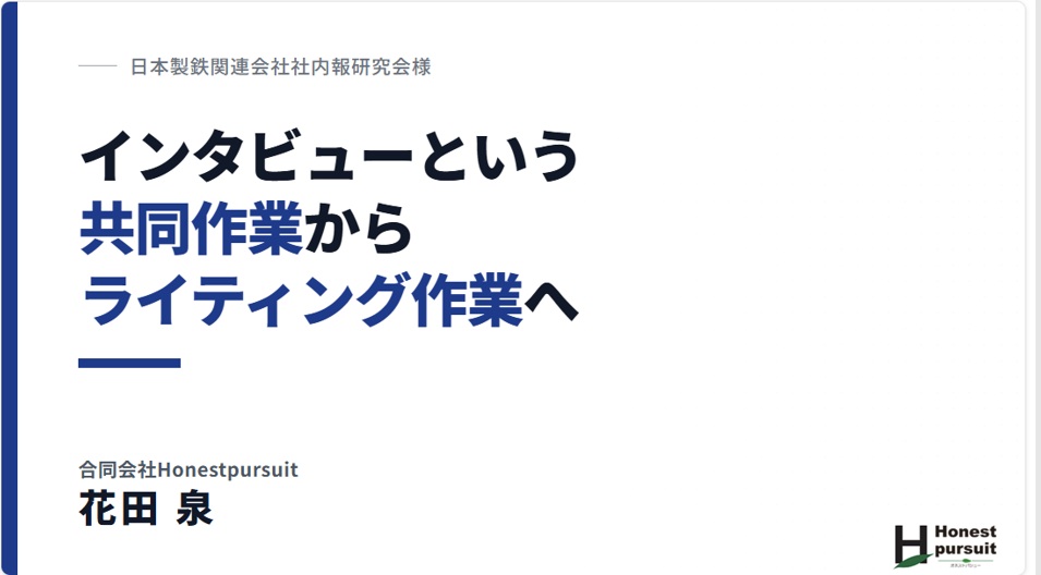 【2月26日】日本製鉄関連会社社内報研究会様に向け、「インタビューという共同作業からライティング作業へ」の講師を務めさせていただきました。日本製鉄関連会社社内報研究会は日本製鉄の関連会社が集まり、社内報の編集を研究されている皆さんの集まりです。社内報もデジタル化が進む環境のなか、こちらの研究会に所属されている企業様は、丁寧に企画・取材をされ、きちんと定期的に発行されているのに敬服! 今回窓口をしてくださった吉川工業株式会社様の社内報はなんと「794号」(2026年2月現在)という発行回数を誇ります。すごい!!なんと66年間毎月発行されているのです! 紙の社内報は、一堂に並べると、それだけで歴史を表すことができます。作り手の苦労は並大抵のものではないかもしれませんが、そこに企業の「いま」が積み重なっているのだと思います。今回、弊社代表・花田は「インタビュー」の手法と、そこからいかに記事にしていくか、という流れをAIの使い方も含めてお話しさせていただきました。ありがとうございました。